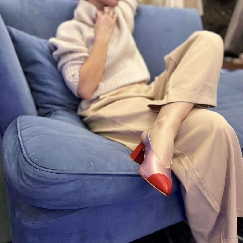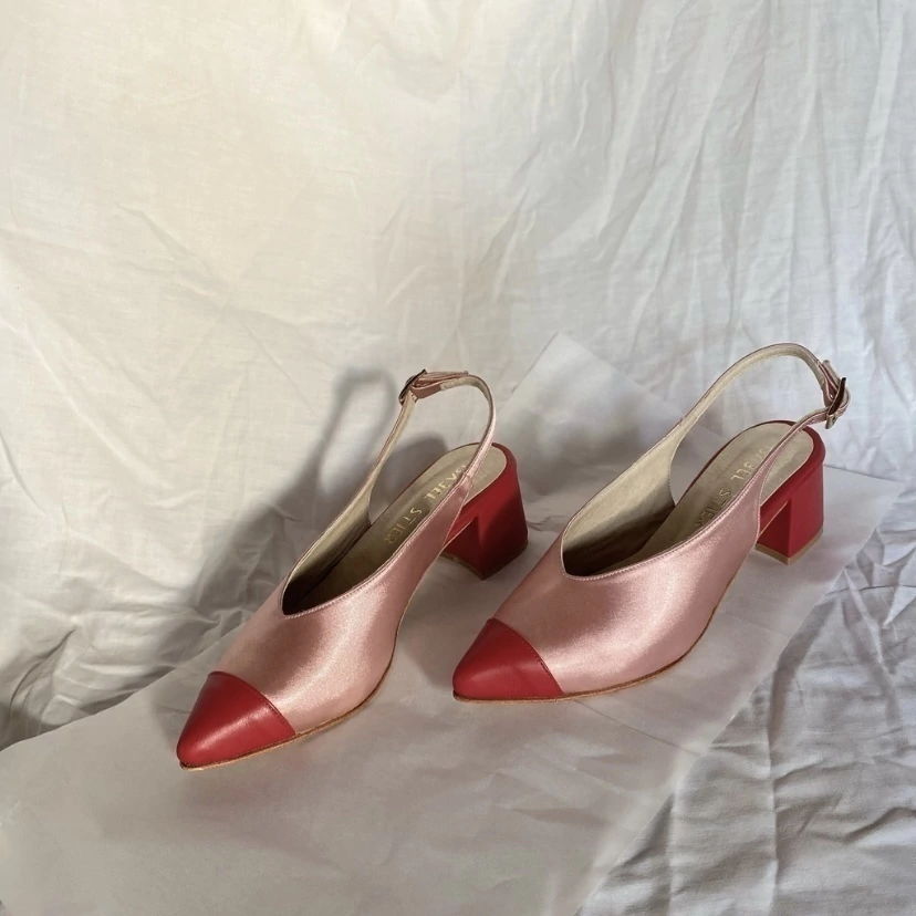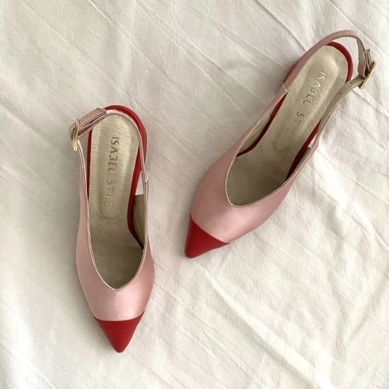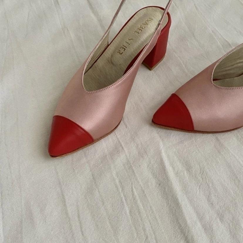 Stiletto en punta donde combinamos texturas con género de raso rosa con puntera en cuero 100% color Rojo.